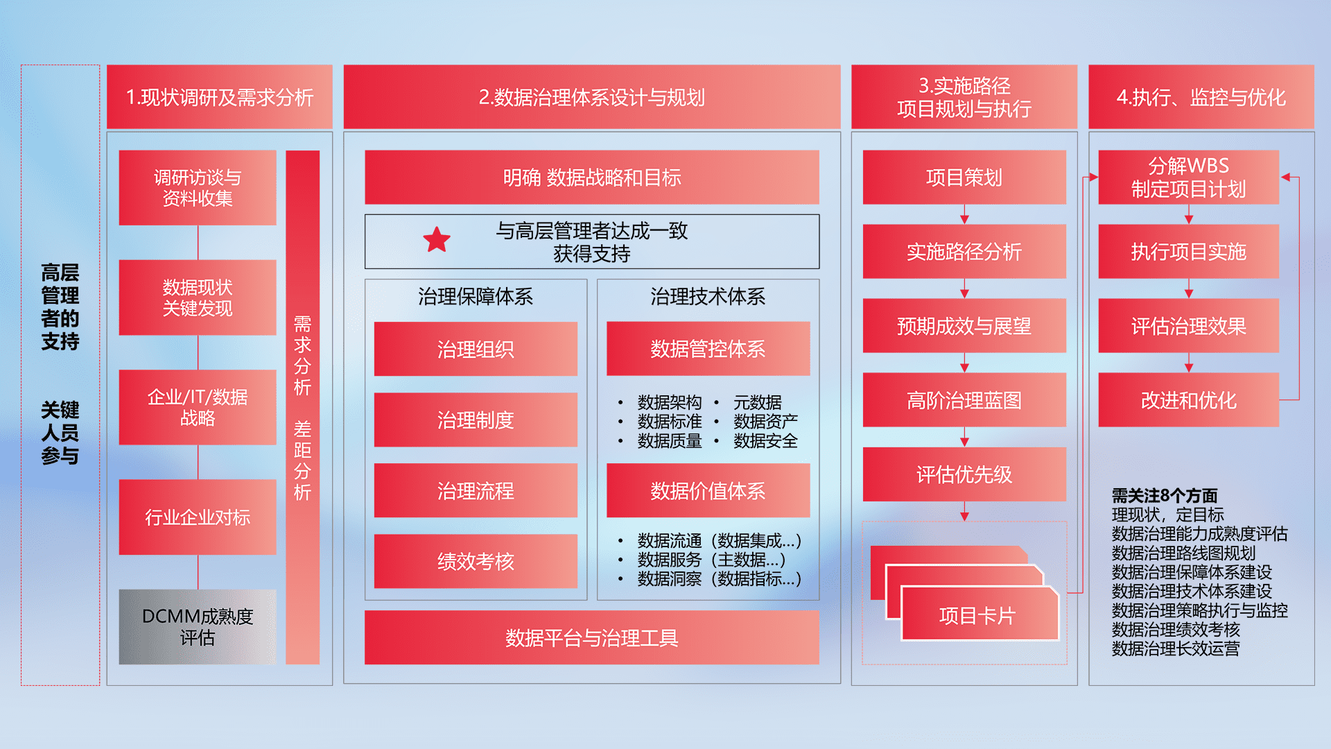 制定并执行统一的数据标准,,,,规范数据定义和格式,,,,消除冗余和不一致性,,,,实现跨部门和跨系统的数据一致性,,,为企业提供标准化的数据基础。。